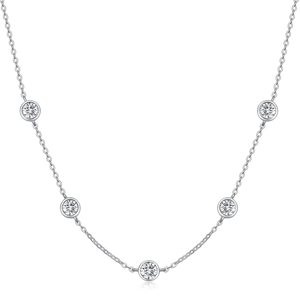 Experimente o luxo e a clareza incomparáveis com a nossa Gargantilha Bubble Moissanite. Este design moderno apresenta cinco moissanites de 5mm flutuando delicadamente na corrente, criando um efeito de "bolha" que captura a luz em 360 graus. O resultado é um brilho superior, muitas vezes mais intenso que o de um diamante tradicional.