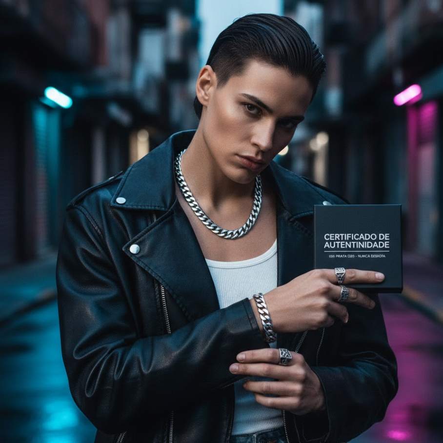 Destaque-se na multidão com a Pulseira Street Style, une a atitude Punk com a sofisticação da Prata 925. Pode ser usado o kit pulseira e colar. É ideal para quem busca um acessório unissex de impacto, capaz de transformar o visual do dia a dia ou completar um look ousado para a noite. As peças possuem um design de elos robustos e contemporâneos, essenciais para o estilo Street Wear.
